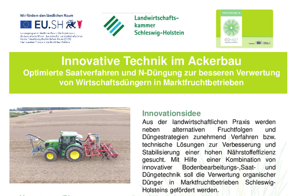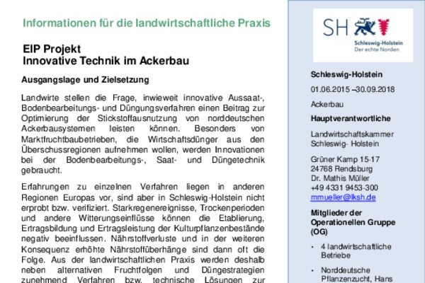 Landwirte stellen sich zunehmend die Frage, inwieweit innovative Verfahren in den Bereichen Aussaat, Bodenbearbeitung und Düngung zur Optimierung der Stickstoffausnutzung in norddeutschen Ackerbausystemen beitragen können. Insbesondere Marktfruchtbaubetriebe, die Wirtschaftsdünger aus Überschussregionen aufnehmen möchten, sind auf technische Innovationen in diesen Bereichen angewiesen. Zwar liegen zu einzelnen Verfahren bereits Erfahrungen aus anderen Regionen Europas vor, jedoch wurden diese bislang nicht unter den spezifischen Standortbedingungen Schleswig-Holsteins erprobt oder wissenschaftlich validiert.