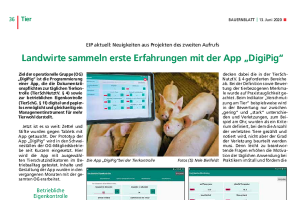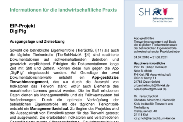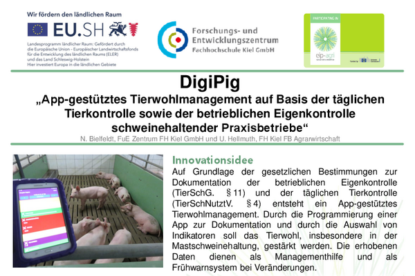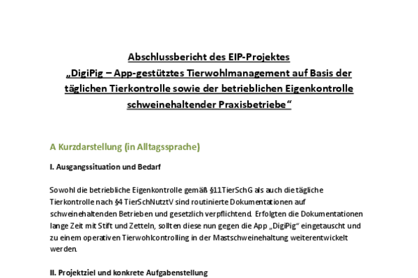 Ziel des Projektes war es, die bislang manuelle Dokumentation mittels Stift und Papier durch die App „DigiPig“ zu ersetzen. Darauf aufbauend sollte ein App-geschütztes Tierwohlmanagementsystem entstehen, das für das tägliche Controlling im Stall genutzt werden kann.