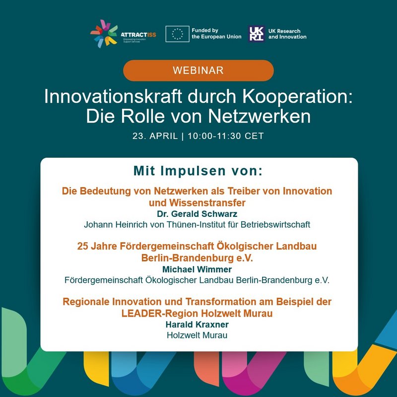 Das Webinar richtet sich an Akteur*innen aus Landwirtschaft, Regionalentwicklung, Beratung, Forschung sowie alle, die sich für Innovationsprozesse und Netzwerkarbeit interessieren. Die Veranstaltungssprache ist deutsch. Die Teilnahme ist kostenlos.
